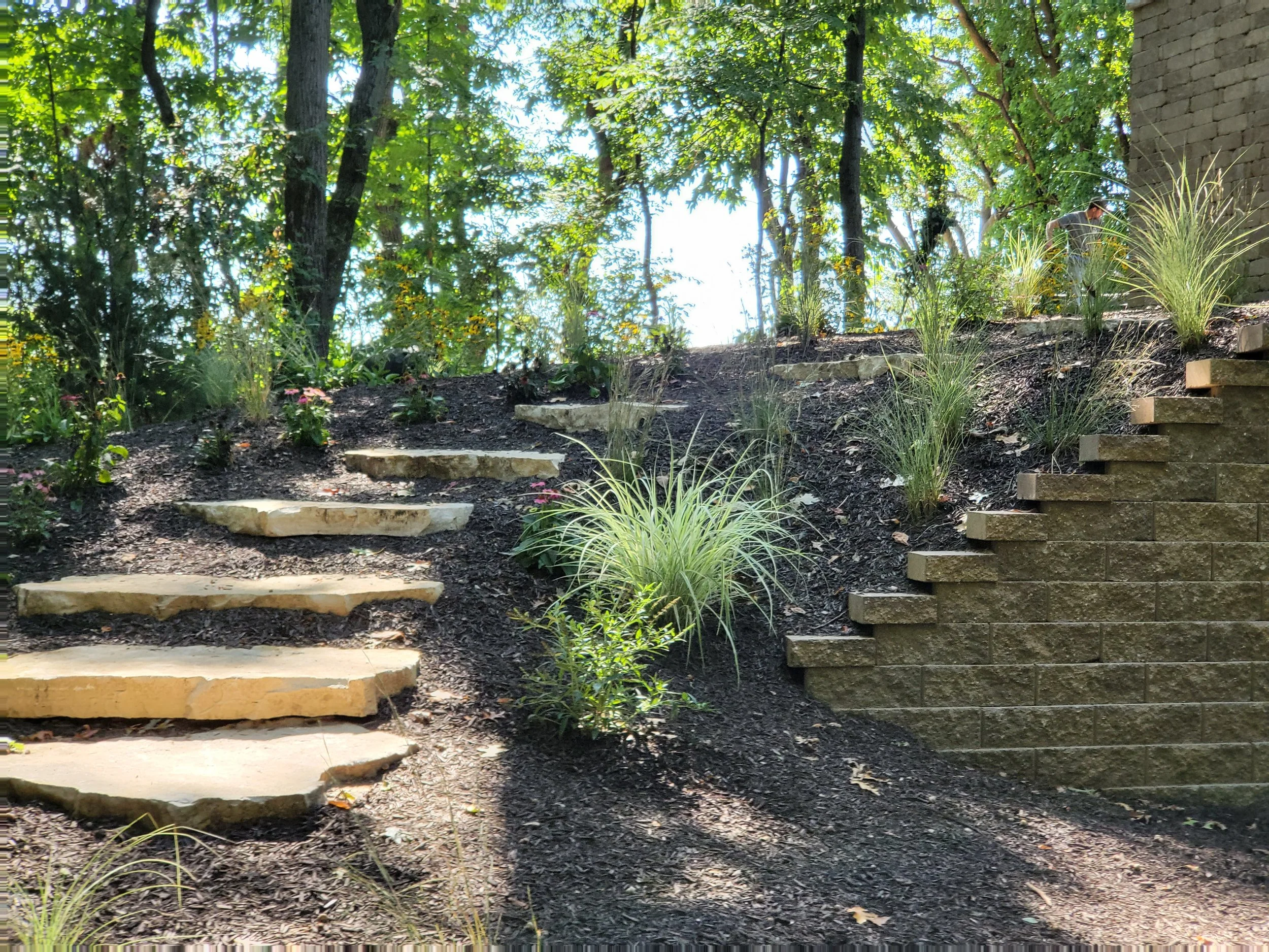Elegant stone steps, planting beds, and outdoor lighting to complete the retreat.